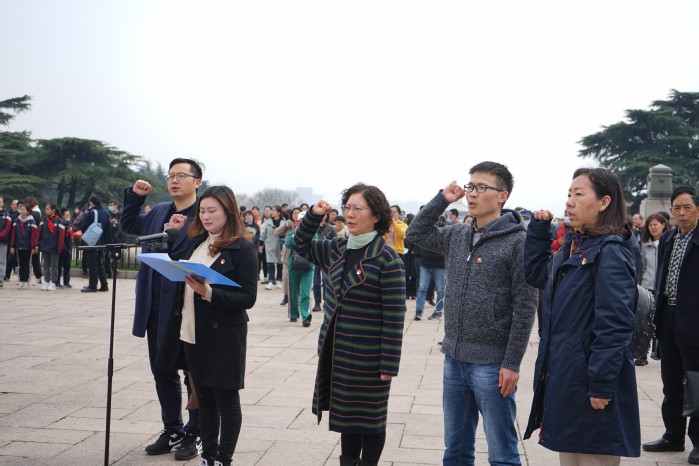 到达雨花台的第一站,师生怀着对英烈的缅怀和尊崇,瞻仰雨花台革命烈士纪念碑,并向烈士敬献花圈。在纪念碑前,全体师生肃立,默哀,向革命烈士致以崇高的敬意。党员教师们重温入党誓词、全体同学重温入团誓词,高举右手、紧握拳头、庄严宣誓。