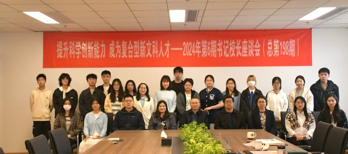 座谈会上,同学们从复合型新文科人才所具备特质能力、如何成为跨学科复合型人才、如何持续提高科研能力、如何平衡理论学习与实践学习以及竞赛之间的关系、如何提高创新思维与综合能力、人工智能时代背景下的职业发展规划等方面进行提问。任校长结合自己经济学的研究方向和丰富高校职教经历,对同学们的问题一一做出了细致的回答,并分享了很多宝贵的经验和优秀校友的励志故事,用实际案例鼓励同学们积极书写奋发有为的青春答卷。