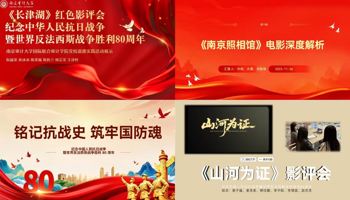 第五小组结合南京国防园参观与《八佰》观影经历,通过抗战时期与现代国防装备的对比,直观展现科技强军成果,提出 “学习历史、强健体魄、关注国防” 的青年行动倡议。第六小组指出,和平年代《南京照相馆》是对抗历史虚无主义与遗忘的有力武器,传递 “捍卫记忆即捍卫尊严与真相” 的精神。第七小组分享《长津湖》影评会成果,结合审计专业特色,阐述新时代审计青年守护国家经济安全的使命担当。第八小组围绕《山河为证》全景式抗战影片展开讨论,分享对爱国情怀、民族气节等抗战精神核心内涵的理解。