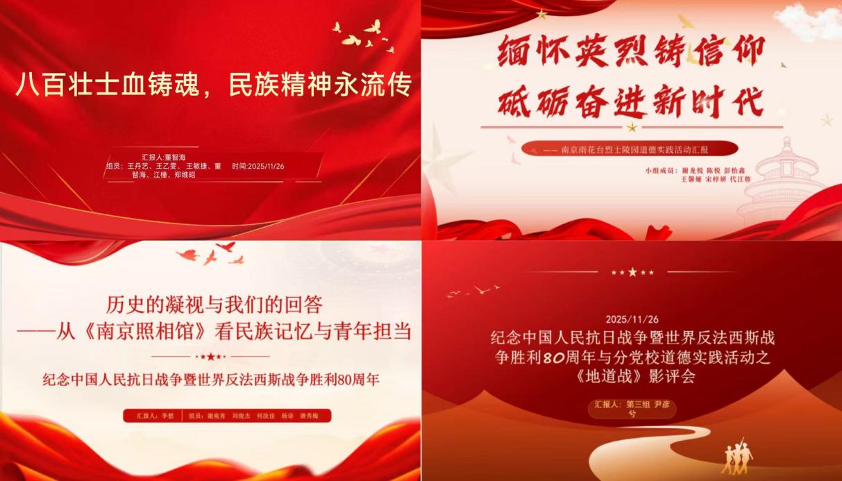 第一小组以雨花台实地研学为核心,分享雨花英烈精神的深刻内涵,强调新时代青年应将英烈信仰转化为岗位担当。第二小组围绕《八佰》观影实践展开汇报,回溯 1937 年四行仓库保卫战的悲壮历史,倡议做历史的铭记者、道德的践行者、时代的担当者。第三小组聚焦《地道战》与抗战胜利 80 周年纪念,介绍地道战的四大战术创新与精神内核。第四小组以《南京照相馆》为切入点,深入剖析南京大屠杀的历史创伤与影片的叙事艺术,呼吁青年主动担当历史记忆传承使命。