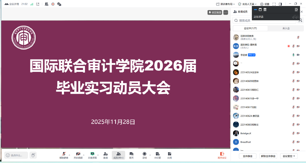 为夯实本科人才培养质量,凝聚实习动力,11月28日下午,国际联合审计学院召开2026届毕业实习动员大会。学院党委书记张晋津、副院长李庭燎,2026届毕业生辅导员、教务员及2026届毕业生参会,会议由李庭燎主持。