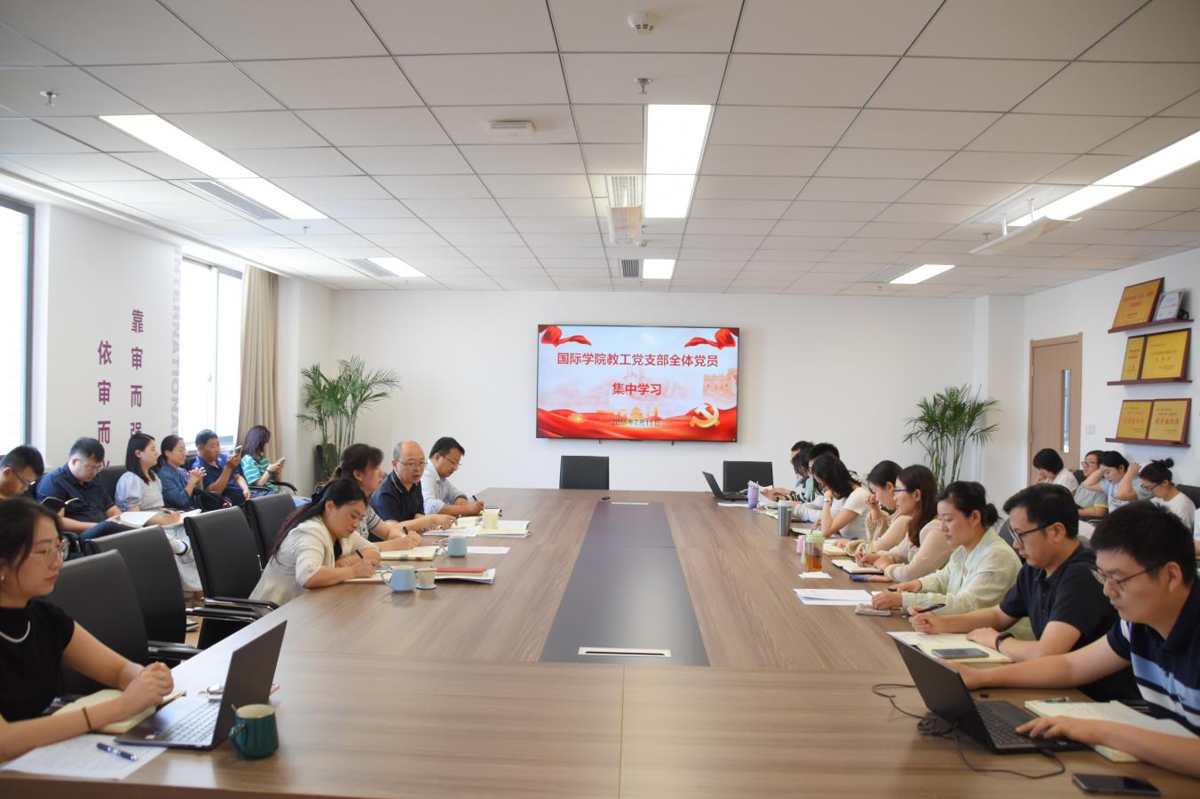 7月11日,国际学院召开党员大会。会上,张晋津领学习近平总书记重要文章《团结奋斗是中国人民创造历史伟业的必由之路》,强调要加强“五史”学习教育,引导师生在学史中领会团结奋斗精神,厚植家国情怀,凝聚奋进力量。王静重温习近平总书记给南京审计大学审计专业硕士国际班留学生的回信精神,强调要坚持以总书记重要回信精神为引领,立足审计特色,全方位推动学院人才培养、科学研究、社会服务、国际合作交流等领域建设。