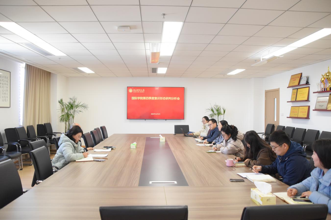 2025年12月3日,国际学院召开第四季度意识形态研判分析会。会上,各科室负责人立足岗位职责,深入研判当前存在的意识形态风险。听取汇报后,学院党委书记张晋津对上述风险进行了分析与指导。