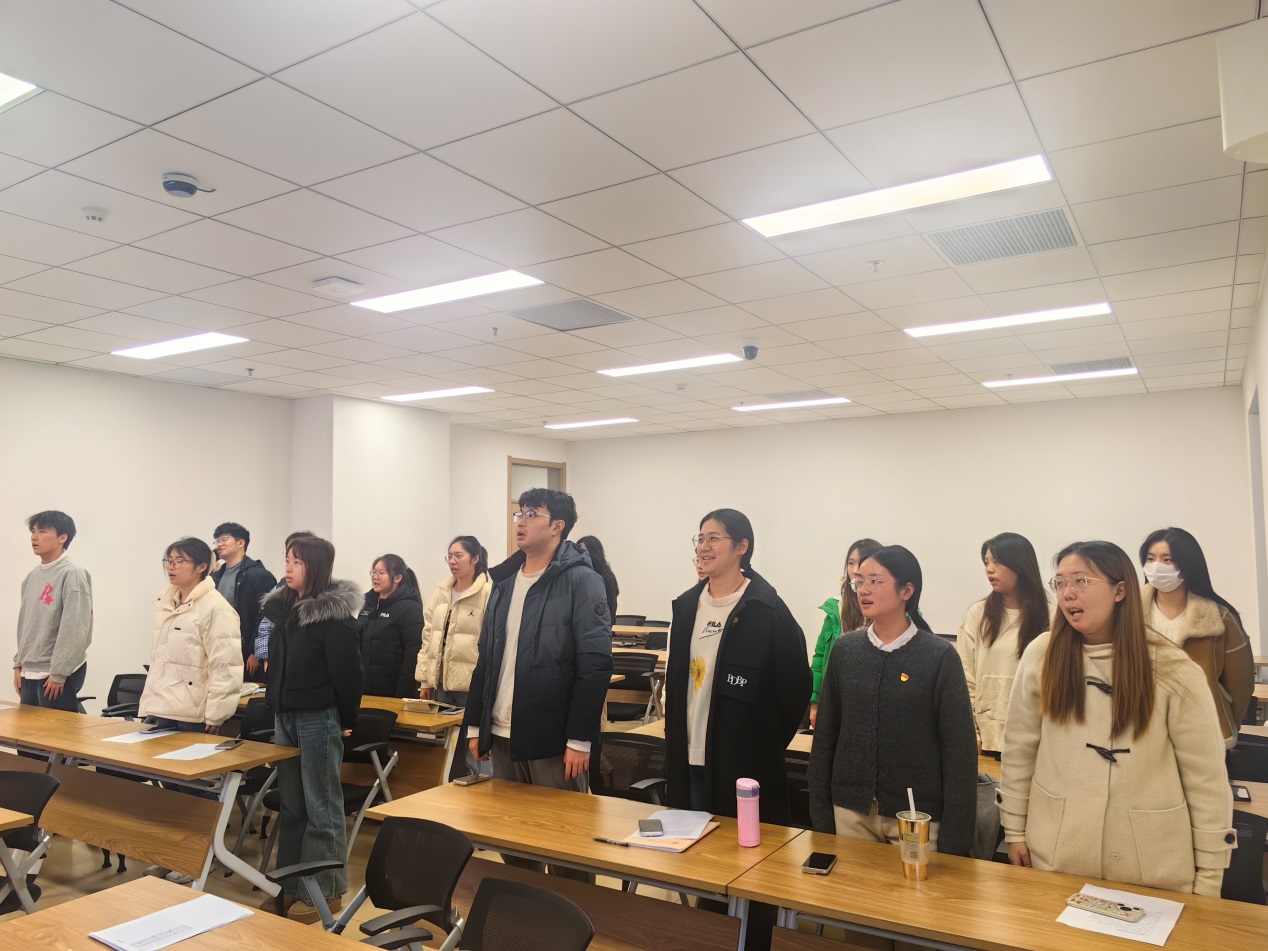 第三项议程,党员宣誓全体奏唱《国际歌》后,支部书记张莹玥同志为新发展党员佩戴党徽。